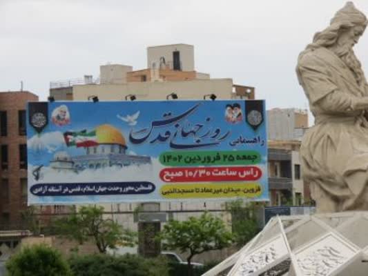 منجم، مدیرعامل سازمان زیباسازی شهرداری قزوین گفت: در آستانه فرا رسیدن روز جهانی قدس، این سازمان اقدام به فضاسازی شهر با نصب بنر بر روی سازه های پرتابل با موضوع روز قدس و دعوت مردم به شرکت در راهپیمایی این روز کرد.