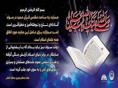 جسارت به ساحت مقدس قرآن مجید در سوئد،حادثهای تلخ و توطئه آمیز و خطرآفرین است،اشد مجازات برای عامل این جنایت مورد اتفاق همه علمای اسلام است،دولت سوئد نیز باید بداند که با پشتیبانی از جنایتکار،در برابر دنیای اسلام آرایش جنگی گرفته و نفرت و دشمنی عموم ملتهای مسلمان و بسیاری از دولتهای آنان را به سوی خود جلب کرده است.