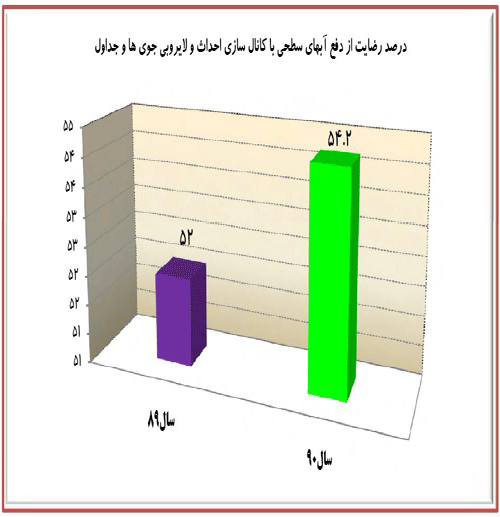 رهبري منش همچنين اذعان نمود كه عليرغم بهبود 2/2 درصدي سطح رضايت از دفع آبهاي سطحي با كانال سازي ، احداث و لايروبي جوي ها و جداول در سال 90 نسبت به سال 89 در مقايسه با حجم کار انجام شده، شهروندان اين موضوع را يكي از نيازهاي شهر دانسته و خواستار افزايش فعاليت در اين زمينه هستند.
