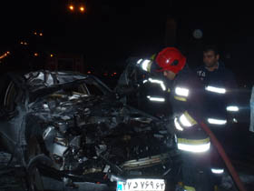 وي ادامه داد : در اين حادثه راننده خودروي پژو به علت شدت حادثه و مصدوميت در خودروي شعله ور خود محبوس شده بود که با حضور نيروهاي آتش نشاني ايستگاه 6 اطفاءحريق و 3 امدادو نجات حريق خودرو مهار و سرنشين آن از خودرو خارج شد.
