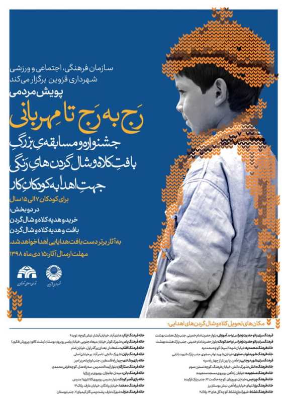 «پویش مردمی رج به به رج تا مهربانی» در قالب جشنواره و مسابقه بزرگ بافت کلاه و شال گردن های رنگی جهت اهدا به کودکان کار توسط سازمان فرهنگی، اجتماعی و ورزشی شهرداری قزوین برگزار می شود.